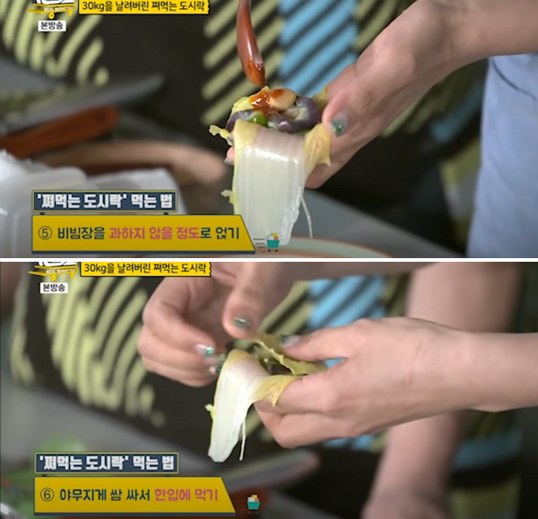 쪄먹는 도시락을 먹는 방법도 간단합니다. 마치 쌈을 싸먹는 것과 같이 하면 됩니다. 잘 쪄진 알배추 위에 각종 야채와 달걀흰자, 도토리묵을 올리고 비빔장을 과하지 않게 얹습니다. 야무지게 쌈을 싸서 한입에 먹으면 됩니다. 맛도 좋고 살 빼는데 정말 효과가 좋습니다.