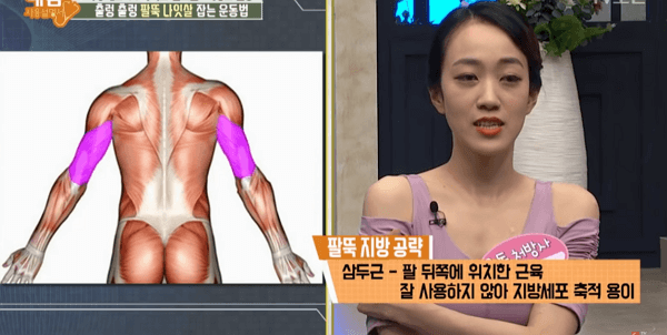 과거 TV조선에서 방송되었던 내몸 사용 설명서에서는 유명 운동 처방사가 출연해서 출렁이는 팔뚝 나잇살 잡는 운동법을 소개해 줬습니다. 팔 뒤쪽에 있는 삼두근은 평소에 잘 사용하지 않기 때문에 지방세포가 잘 쌓인다고 합니다.