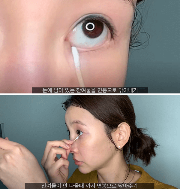 마지막 과정입니다. 눈의 경우에는 세안을 한 후에도 잔여물이 남는 경우가 많습니다. 특히 눈 화장을 하는 여성들의 경우에는 눈에 남아 있는 잔여물을 면봉으로 깨끗하게 닦아 내는 것이 중요합니다.