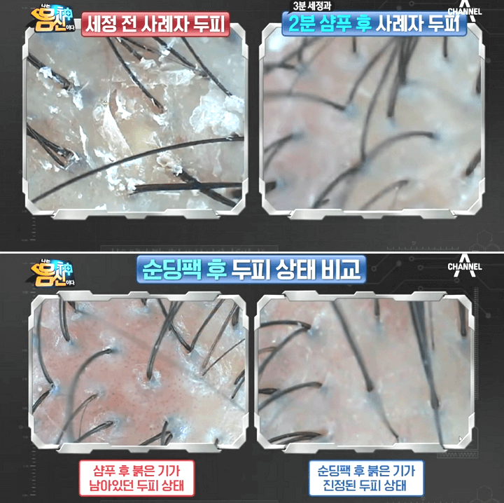 이날 방송에서는 실제로 탈모로 고생하는 참가자의 사례를 보여 줬습니다. 탈모 솔루션 3단계를 모두 실시한 결과 두피가 깨끗해진 것을 확인할 수 있었습니다. 올바른 샴푸와 순딩팩을 한 후 두피 상태를 비교해 볼 수 있었습니다.
