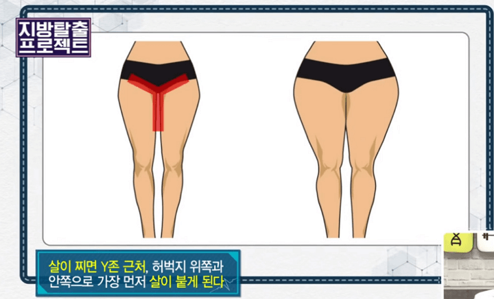 주인공의 말에 따르면 Y존이 바로 몸속 지방과 노폐물이 빠져나가는 비밀 통로라고 합니다. 살이 찌기 시작하면 대부분 Y존 근처 즉, 허벅지 뒤쪽과 안쪽으로 제일 먼저 살이 붙는다고 합니다. 많은 분들이 경험해 보셨을 겁니다.