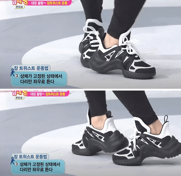 장 트위스트 운동을 할 때 가장 중요한 포인트는 상체는 고정된 상태로 운동을 하는 것입니다. 상체가 고정되어 있어야 복근을 활용해서 다리만 틀어서 운동 효과를 극대화할 수 있습니다.