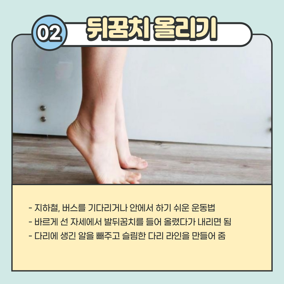 - 바르게 선 자세에서 발뒤꿈치를 들어 올렸다가 내리면 됨