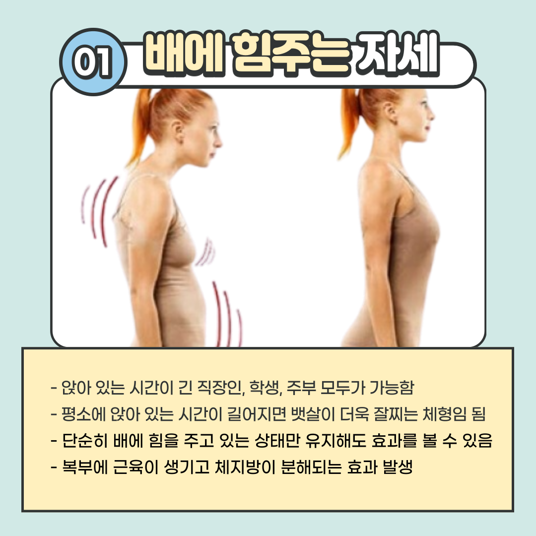 - 평소에 앉아 있는 시간이 길어지면 뱃살이 더욱 잘 찌는 체형임 됨