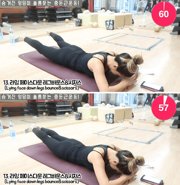 바닥에 매트를 깔고 엎으려서 누우세요. 양손을 이마 아래에 포개어 놓습니다. 복부를 바닥에 밀착시킨 후에 엉덩이에 힘을 주고 다리를 들어 올립니다. 이제 다리를 벌렸다가 모으는 동작을 60초 동안 반복하면 됩니다.