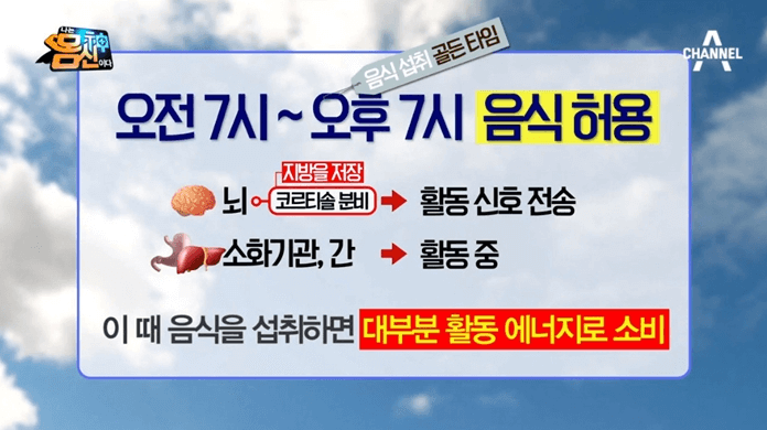 사람이 깨어 있는 시간 즉, 오전 7시부터 오후 7시까지만 음식 먹는 것을 허용합니다. 이 시간대에는 뇌에서 코르티솔이 분비되고 지방을 저장하게 됩니다. 이것을 우리 몸에서는 활동 신호로 전송하게 됩니다. 각종 소화기관과 간이 활동하게 됩니다. 이때 음식을 섭취하게 되면 대부분 활동 에너지로 소비되기 때문에 살이 잘 찌지 않습니다.
