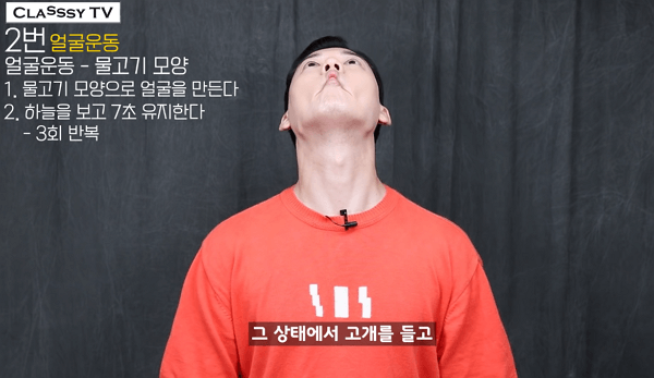 물고기처럼 입을 모아 주세요. 양쪽 볼을 안으로 빨아드린 모습이 됩니다. 이 상태에서 하늘을 보고 7초간 유지합니다. 3회 반복해서 해주세요.