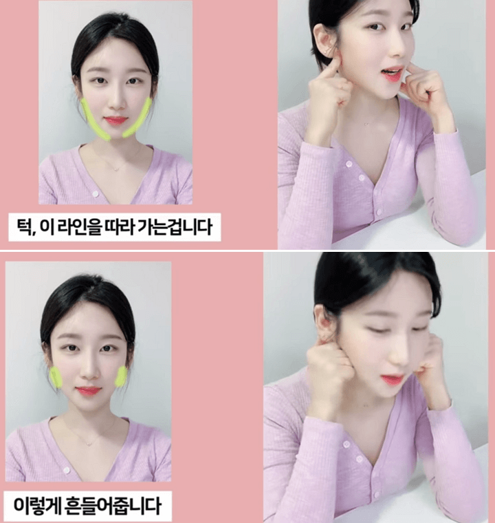특히 얼굴형이 사각형인 분들은 턱 부분의 근육이 많이 뭉쳐 있는 경우가 많습니다. 따라서 이 부분을 주먹을 살짝 쥔 상태에서 흔들면서 마사지해주면 좋습니다. 꾸준히 한다면 날렵한 턱선으로 거듭날 수 있습니다.